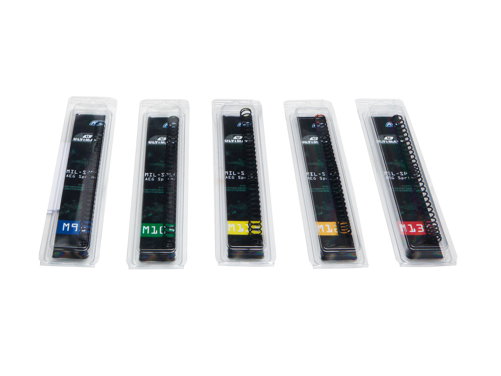 ASG Ultimate Upgrade Springs are manufactured from military grade steel for the best performance possible. Using SiCr grade steel allows Ultimate Springs to offer maximum power and consistency with every shot. Tightly coiled and ground spring ends and progressive coiling ensure that the Ultimate Spring remains correctly aligned and consistently compressed and released in your AEG regardless of the rate of fire. Each Ultimate Spring has been rigorously tested and pre-compressed, minimizing power loss from initial compression found in competing brands. Each ASG Ultimate Spring has a convenient color coded end so that you can see at a glance what power level you have selected. Available in M95 (Blue) , M105 (Green) , M115 (Yellow), M125 (Orange), and M135 (Red)